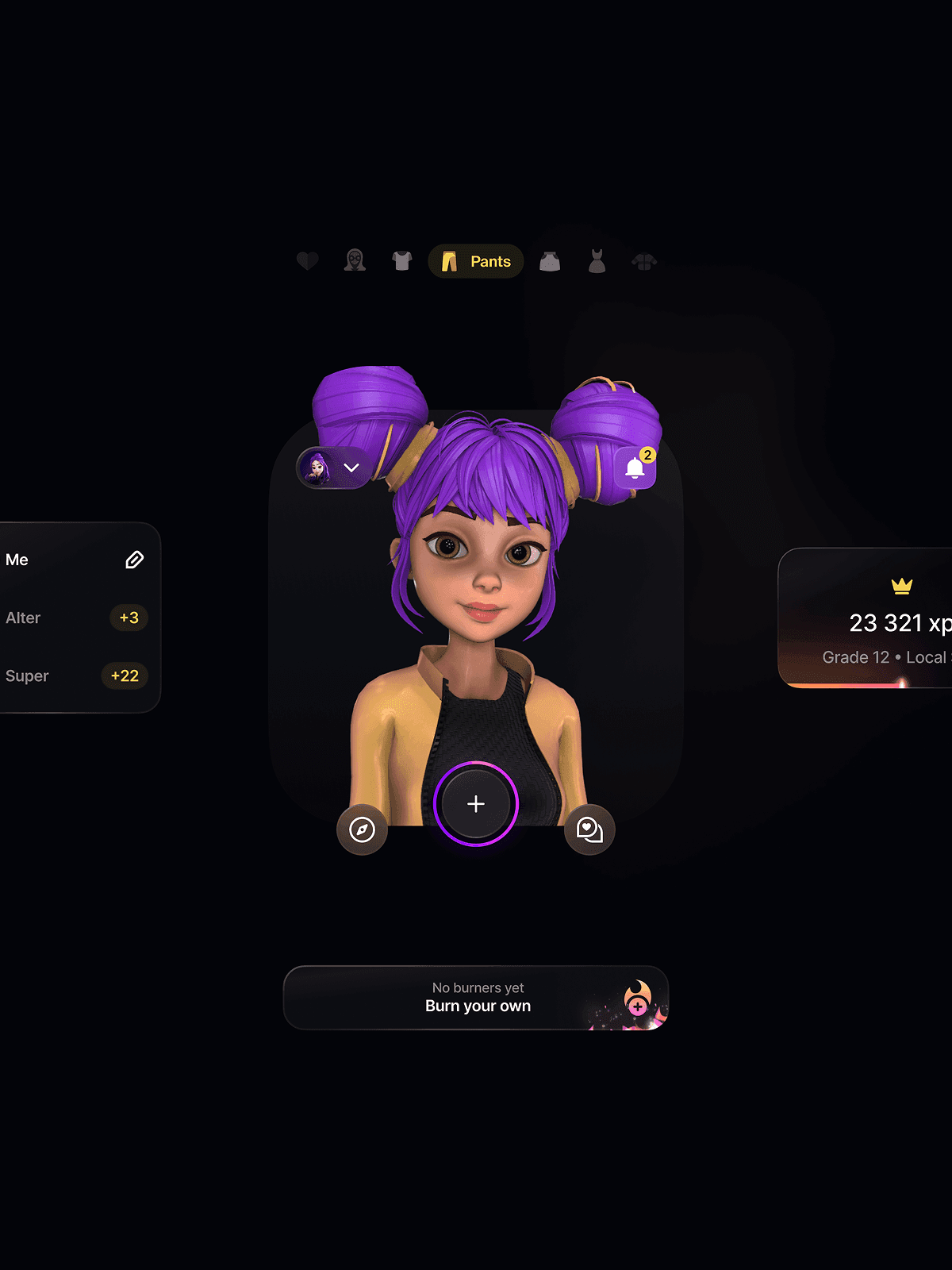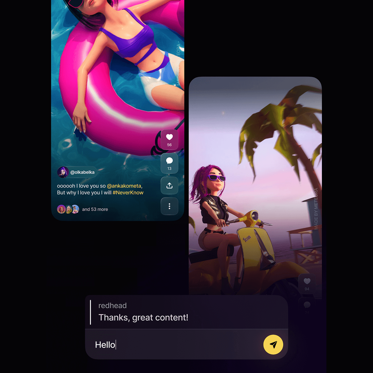 An experimental project by the Lab. This is an app where users can create avatars and customize their appearance. Meteora had various social mechanics: a feed with short videos, chats, adding friends, and dating
