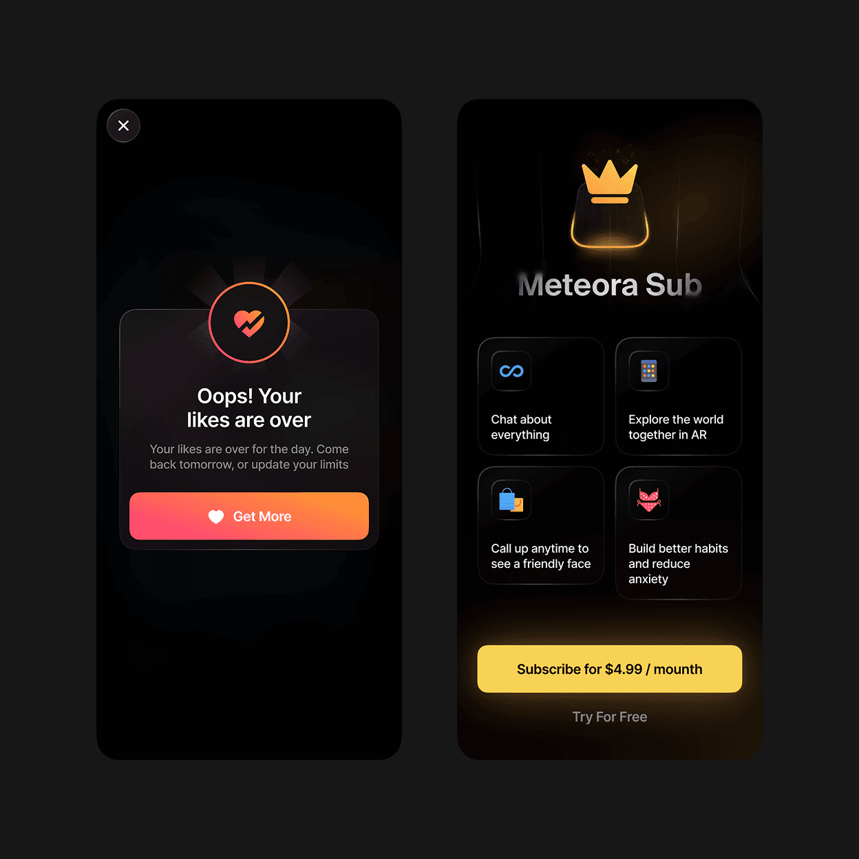 We added dating mechanics to the app with familiar swipes and likes. To encourage monetization, we limited the number of likes: when the “hearts” ran out, the user was offered a subscription.